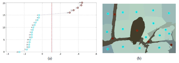 A partir de la matriz 𝐿𝑛 se calculan los valores y vectores propios de esta, seguido, se extraen los 𝑘𝑝 vectores propios de menor valor. Para dos grupos, se utiliza el vector propio correspondiente al segundo valor propio más pequeño (Fiedler vector), el cual tiene información sobre cómo segmentar los superpíxeles, diferenciando los dos grupos mediante sus componentes positivos y negativos (figura 5a); este vector propio es unidimensional y contiene la misma cantidad de datos que superpíxeles en que fue presegmentada la imagen (figura 5b).