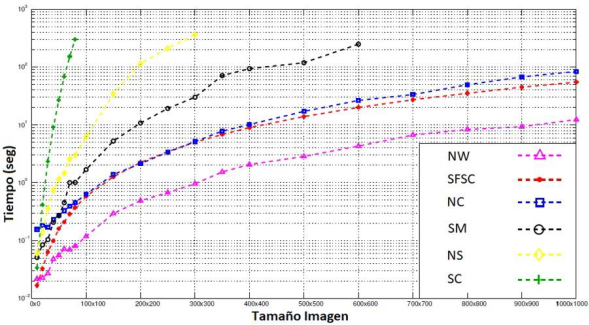 El algoritmo con mayor eficiencia es NW, esto se debe a que permite solucionar el problema de valores y vectores propios con una baja cantidad de elementos de la matriz de características; por este motivo se ahorra el cálculo de la matriz laplaciana, aunque para algunos casos sufre indeterminación en la solución del problema de valores y vectores propios. NC y SFSC tienen un rendimiento similar debido a que presentan una etapa de presegmentación basada en SLIC, la cual determina un mejor rendimiento. El bajo desempeño de los algoritmos SM, NS y SC se debe a que realizan la segmentación con todos los píxeles de la imagen (sin superpíxeles), además utilizan una estructura en árbol, que se ejecuta iterativamente hasta realizar los mejores cortes.