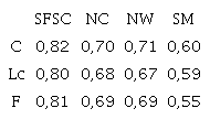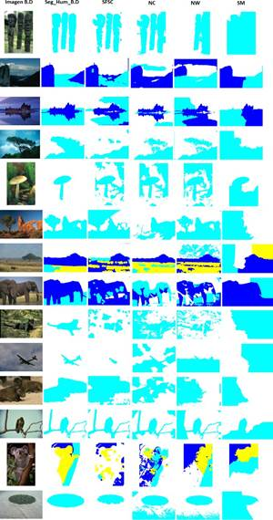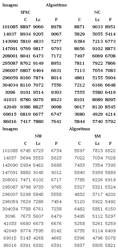 De la tabla 1, se observa que el algoritmo SFSC presenta la mayor cantidad de aciertos para la media armónica entre C y Lc. SFSC de 14 imágenes segmentó 11 como mejor segmentación y 2 como segunda mejor segmentación. La tabla 2 presenta el valor promedio de las medidas externas, calculado sobre el conjunto de 14 imágenes de la base de datos; el algoritmo SFSC logra una precisión de 0,82, recall de 0,8 y media armónica F de 0,81. El algoritmo NW encuentra segmentos pequeños para ser asignados a un segmento más lógico, a NC y SFSC se les dificulta encontrar este tipo de regiones debido a la implementación de SLIC como presegmentación.