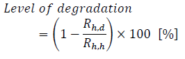 The values of FF, Rh, NΔRh, and CR are plotted in Figures 6, 7, 9, and 8, respectively. In those figures, the values on the x-axis represent the level of degradation, calculated by using the equation 10, where Rh,d is the degraded parallel resistance, and Rh,h is the parallel resistance in STC of the PV panel without any degradation (see the Table 2).