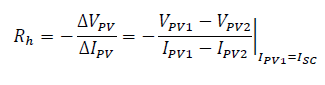 It is possible to obtain certain parameters like shunt resistance from the I-V curve of a PV panel. As illustrated in Figure 2, Rh is the inverse of the slope of the I-V curve close to the short-circuit point, as given by (5), which is considered an accurate estimation for the shunt resistance for the SDM [31]. For a better estimation of Rh , IP V 2 should be close to IP V 1 . Furthermore, it is possible to fit the I-V curves of a PV panel to the SDM by using methods like Newton-Raphson or Levenberg-Marquardt. The accuracy of parameters’ estimation will depend on the quality of the dataset and the initial guess solution [29].