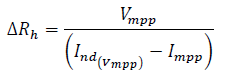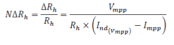 (5)The work in [32] proposes NΔRh as an indicator to detect reductions in the MPP current (Impp) of a PV panel, expressed by (7) as the relative value of a variation of shunt resistance ΔRh concerning a reference value Rh, the last corresponding to the PV panel without degradation. ΔRh can be seen as an additional resistance connected in parallel to Rh (see Figure 3), that produces the same reduction in Impp. Since PID produces reductions in Rh (ΔRh), NΔRh can be used to detect PID. To that end, it is necessary to know Impp and Vmpp of the degraded panel, the current of the PV panel without degradation (IP V ), and the reference value of Rh, according to (6), (7), and the Figure 4. For equation (7), Impp and Vmpp can be obtained from data monitoring of the PV system. The photovoltaic current of the non-degraded PV panel (Ind) and the reference value of Rh could be estimated with the approach described in [33] based on the PV panel datasheet, or through parameterization of the single-diode model from experimental I-V curves, for a given operating condition. In this work, the method described in [33] has been used.