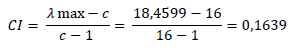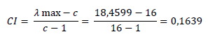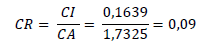 (1)Una vez calculado el máximo valor propio, se procedió a encontrar el índice de consistencia (CI), donde al máximo valor propio se le sustrajo el tamaño de las columnas de la matriz y se dividió entre el tamaño de las columnas de la matriz menos 1. En la ecuación 2 se identifica el proceso que arrojó un valor equivalente a 0,1639.