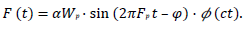 Several models have proposed a single degree of freedom dynamic system with mass, spring and damper elements to represent a person walking on a structure. This perspective, derived from the moving oscillator (MO) problem [44], [45], [46], [47], implements a periodic force that describes the GRF applied to the footbridge at the pedestrian location [41], [48], [49]. Both the MF and MO models include a periodic function that has been shown to represent the vertical force applied by a pedestrian [6]. This function is expressed as a Fourier series multiplied by the mode shape to obtain the effective modal force as From Eq. (1), the single-step forcing function 𝐹 (𝑡) is represented by an amplitude corresponding to the weight of the pedestrian 𝑊𝑝 and a sinusoidal function, which includes the harmonic components of the step load. The pace frequency is specified by 𝐹𝑝 in the vertical or horizontal direction, 𝜙 (·) is the normalized fundamental mode shape of the structure, 𝑐 is the constant anterior-posterior velocity of the pedestrian and 𝑡 represents the time. 𝛼 and 𝜑 are the Fourier coefficient and phase lag of the first harmonic, respectively.