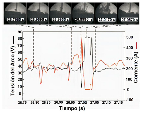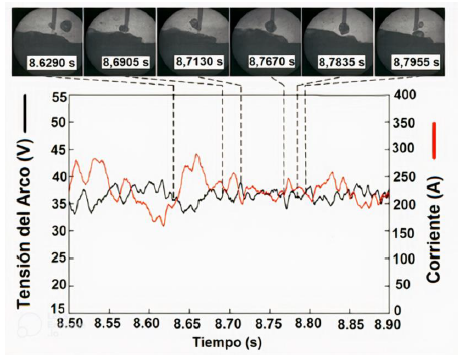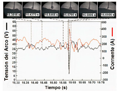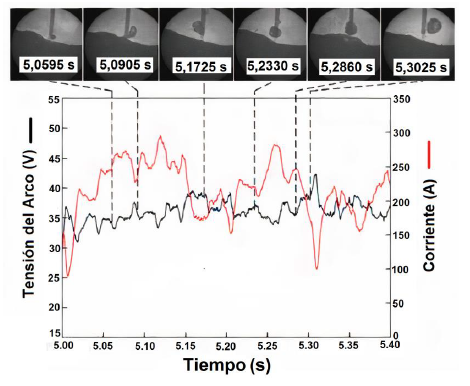 La figura 1 muestra un esquema de los resultados experimentales de Guo et al. [33]. Durante el proceso de transferencia metálica (de 5.0595 s a 5.3025 s), la gota que se forma en la punta del electrodo es repelida violentamente desde el eje del alambre por las fuerzas repulsivas y gira alrededor de la punta debido a la variación de las fuerzas gravitacional y repulsiva. Una vez que la gota crece hasta su tamaño máximo, se desprende de la punta del alambre bajo la acción de fuerzas repulsivas que aumentan en 5.3025 s, con un ángulo de desprendimiento mayor de 90°. Mientras tanto, el voltaje del arco aumenta de 38.2 V a 42.4 V y la corriente de soldadura disminuye de 172.1 A hasta 101.4 A. La gota fundida es repelida repetidamente durante su formación y las señales eléctricas oscilan considerablemente, indicando la poca estabilidad de este proceso de transferencia metálica.