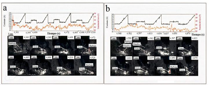En la figura 10 (a) se muestra que, para el instante de 4.472 s, la gota creció hasta un diámetro máximo de 2.5 mm, el cuál es menor en comparación con los 7.2 mm de diámetro en la gota reportados para la soldadura submarina utilizando alambre tubular convencional. Se calculó que la transferencia metálica ocurrió de 4.361 a 4.518 s, lo que tomó 157 ms en total. En la figura 10 (b), se observó una pequeña gota recién formada en la punta del alambre, para el instante de 4582 s. Posteriormente creció hasta un diámetro de 2.8 mm, momento en el cual tocó el charco de soldadura. El periodo de transferencia fue de 152 ms, permitiendo determinar que el comportamiento de las gotas fue similar.