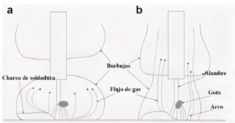 Debido a que el proceso es estable y no presenta salpicadura, este comportamiento es identificado en la literatura como un tipo de transferencia de masa ideal en la soldadura húmeda con alambre tubular [33].