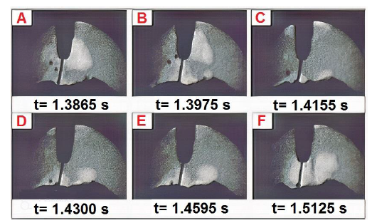 Debido al efecto de la fuerza del arco sobre la superficie del charco de soldadura, el metal líquido es empujado hacia un lado y se forma una cavidad directamente debajo del arco. En consecuencia, cuando la longitud del arco se acorta, la punta del alambre entra en la cavidad comprimida. Por lo tanto, el proceso de transferencia de metal no se puede observar claramente en las imágenes capturadas a alta velocidad, por lo que este modo es denominado transferencia metálica de arco sumergido [27], tal como muestra la figura 5.