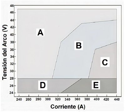 En la soldadura submarina húmeda, el modo de transferencia de metal no se comporta de una única manera, ya que puede estar presente un modo de transferencia mixto, en función de los parámetros del proceso. Como el modo de transferencia explosiva rara vez se observa, el modo de transferencia mixto consta principalmente de tres modos fundamentales diferentes, a saber, el modo de transferencia globular repelida, el modo de transferencia de tensión superficial y el modo de transferencia de arco sumergido. Tal como muestra la figura 6, el modo de transferencia mixta está relacionada con los valores de los parámetros del proceso [27].