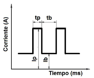 Como se muestra en la figura 7, la soldadura con arco eléctrico y corriente pulsada es un proceso que tiene como objetivo alternar periódicamente el valor de corriente entre dos niveles (corriente base y corriente pico), cada uno con una duración en el tiempo (tiempo pico y tiempo base), con el fin de controlar la transferencia metálica [37].