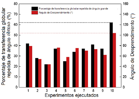 En la figura 8 se muestra que en el experimento 3 y con el uso de tecnología FCAW-P (Flux cored arc welding -Pulse, se obtuvieron las mejores condiciones, presentando ángulos de desprendimiento menores en comparación con el experimento 10, el cual demarca el proceso FCAW convencional.