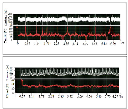 En la figura 9, se muestran los oscilogramas de tensión y corriente de soldadura antes y después de aplicar el sistema de control de longitud del arco eléctrico. De este modo, el sistema mantuvo la tensión del arco dentro de un rango y como resultado, no se produjeron interrupciones o extinciones en el arco de larga duración. El nivel de corriente de pulso promedio fue ajustado por el controlador PI híbrido. Esto indicó que la longitud del arco fue bien controlada en el FCAW utilizado en UWW.