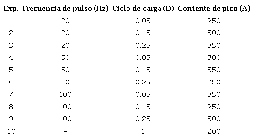 Además de la corriente promedio (Ia) de 200 A, se definieron otros parámetros para los diferentes experimentos, como se muestra en la tabla 1.