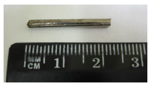 The rods obtained by copper mold casting (Figure 1) were structurally analyzed by X-ray diffraction. In the diffraction pattern (Figure 2) can be observed only broad peaks characteristic of an amorphous structure.
