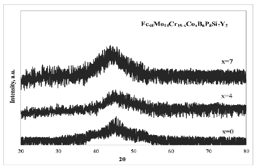 Ingots of Fe48Mo14Cr15-xCoxB6P8Si7Y2 (x = 0, 4, 7) were prepared by induction melting the mixture of pure elements Fe, Cr, Co, Y metals and Fe-Mo, Fe-B, Fe-P and Fe-Si ferroalloys in an argon atmosphere. The alloy compositions represent the nominal atomic percent. The master alloys were remelted four times to obtain a better homogeneity. Bulk amorphous alloys in rods form with the diameter of 2 mm and length of 20 - 25 mm were prepared by the copper mold casting method.