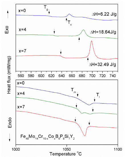 The DSC curves of the elaborated alloys of Fe4sMo14Cr15-xCoxB6P8Si7Y2 (x = 0, 4, 7) are showed in Figure 3. The alloys exhibit an exothermic peak which marks the crystallization event and an endothermic peak for the melting. The glass transition temperature Tg, the crystallization temperature Tx, the melting temperature Tm and the liquidus temperature Tl for each alloy were determined and listed in Table 2. With increasing the Co content, the glass transition temperature Tg and the crystallization temperature Tx move to higher values, meanwhile the melting temperature and liquidus temperature Tl slightly moves to lower values.