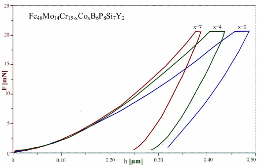 In Figure 4 is represented the typical load-displacement (P-h) curves of as-cast rods (x=0, 4, 7) obtained from the constant loading rate of a 40mN/min. With the increase of Co content, the maximum indentation depth is decreased from 325 to 281 and to 248 nm, respectively.