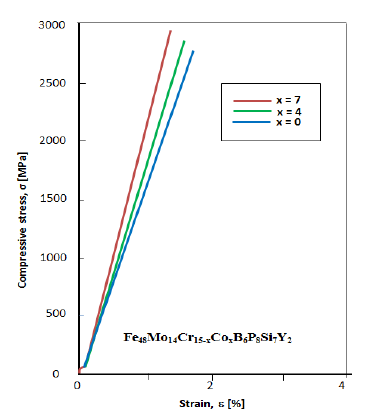 The compression tests showed also an increase of compressive strength from 2823 MPa to 2958 MPa with increasing the Co content. The compressive strength depends on the atomic size distribution and the chemical bonding between the atoms of the alloy elements. Increasing the atomic size distribution and bonding strength leads to a higher fracture strength [29]. These alloys containing metals and metalloids, form strong covalent bonds. Increasing the number of metals in the alloy can generate new covalent bonds [8]. Therefore the addition of Co, which forms chemical compounds with B, P, and Si increases the number of covalent bonds and thus increase the strength of the material.
