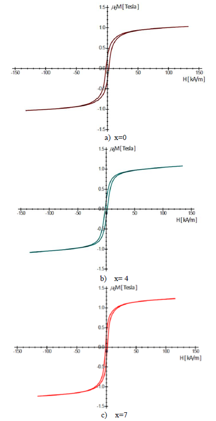 The magnetic hysteresis loops of the as-cast rods at room temperature are presented in Figure 6, and the values of saturation magnetization and coercivity are listed in Table 6.