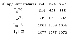 The amorphous structure of the elaborated samples was examined by X-ray diffraction XRD using an X'Pert3 Powder diffraction system, with the radiation of a Cu anode with a wavelength 1 = 1.54 Å. The thermal stability was investigated by differential scanning calorimetry (DSC) using a Netzsch STA 441 Jupiter under a flow of purified nitrogen. The glass transition temperature Tg, the crystallization temperature Tx and the melting temperature Tm were determined as the onset temperatures of the glass transition the crystallization and melting peak, respectively, and the liquidus temperature Tl as the offset of the melting peak during heating with a constant rate of 0.33 K/s.