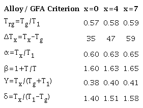 The ability of a metallic alloy to transform into a glassy state is defined as the glass-forming ability (GFA). The GFA evaluation was estimated by calculating the popular parameters summarized in Table 1 [1], [2].