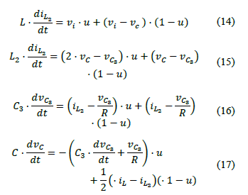 Using the equations obtained under the Q switch states, Equations (14) to (17) govern the behavior of the converter. The commutation function u is defined to conveniently write the DEs. When u = 1, the switch is closed, otherwise, when u = 0, the switch is open.