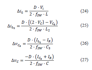 Equations (24), (25), (26) and (27) refer to the ripple of the inductor current L, the inductor current L2, capacitor voltage C3 and capacitor voltage C, respectively. These equations resulted from discretizing Equations (14), (15), (16) and (17). Also, the switching frequency (fsw) (Δt = ) was considered.