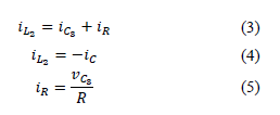 Equation (7) is obtained from Kirchoff's current law at node B, replacing Equation (5) in (7) which gives Equation (8). This indicates that when Q is closed, L2 is charging; therefore, capacitor C3 delivers energy.