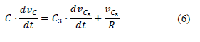 From Kirchhoff's current law at node C, Equation (11) is obtained, which together with Equation (5) results in Equation (12). This last Equation is lower than zero; in consequence, C3 is storing energy.