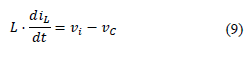 Equation (9) is obtained by applying Kirchoff's voltage law to mesh 1, taking the mesh current in a clockwise direction and applying the passive law of signs. This Equation is lower than zero, so the inductor L delivers energy.