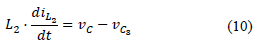 Bearing in mind the considerations described above regarding capacitors C1 and C2, from Kirchoff's voltage law in mesh 2, Equation (10) results; which, being lower than zero, indicates that the inductor L delivers energy.