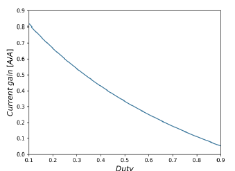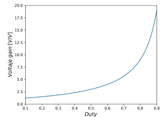 Figure 9 illustrates the voltage gain, which is higher at the converter output when duty increases. The opposite behavior occurs with the current gain, Figure 10, as the duty increases, the current at the converter output is lower. In both Figures there is a response similar to an exponential function, due to the fact that the converter does not present power losses.