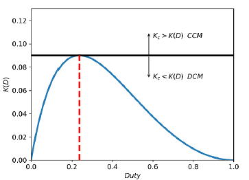 Figure 11 shows the plot of K(D) and its maximum value that can be found using differential calculus. The maximum value of K(D) is 0.9015 at a duty of D = 0.2361. So any converter with an Kc greater than this value will exhibit CCM for any duty cycle value at steady state.