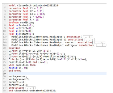 A simulation was carried out using the default compiler and solver in OpenModelica Connection Editor (OMEdit), version 3.2.2. Figure 9 shows the implementation in OpenModelica of the converter depicted in Figure 1. The circuital converter and the DEs that are in the right box at the top of Figure 12 were both implemented. Figure 13 corresponds to the script where DEs were written in OpenModelica for validating purposes.