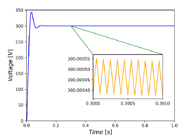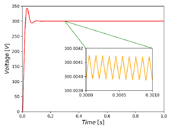 The switching frequency is 10kHz, the duty cycle is 0.5 and the setpoint of the output voltage is 300V. The HB converter was parameterized as follows: L1 = L2 = 10mH, C1 = C2 = C3 = 500µF, R = 10Ω and v, = 100V.