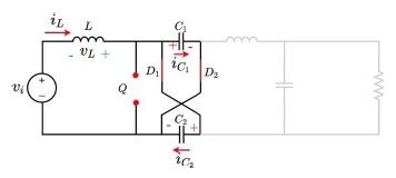 When Q opens, L reacts meaning that it starts delivering energy. As it is well known, inductors can not have sudden changes in their current, so what happens is that the voltage reacts (blue color) due to the opening of Q. In this switching state, C1 and C2 are absorbing since diodes, D1 and D2 are directly polarized, allowing the flow of current through the capacitors as shown in Figure 3C1 and C2 references are labeled in this step
