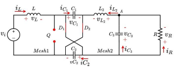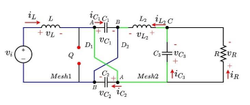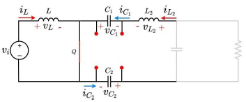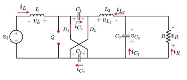 The methodology corresponds to successively closing and opening the power switches which permits observing the transfer of energy between passive elements. Each closing and opening state corresponds to a commutation that is depicted one by one using a graphical method. Voltage polarities and currents directions when each passive element absorbs energy (passive law sign) are drawn in red color and correspond to the references. While negative voltage polarities and negative current directions that are drawn in blue color are defined as the reactions, under this condition the element delivers energy. The HC converter under study is depicted in Figure 1. It is composed of the following elements: 1) an input DC voltage source (vi ), 2) two inductors (L) and (L2), 3) three capacitors (C1), (C2) and (C3), 4) two diodes (D1) and (D2), 5) a power switch (Q), and 6) an output resistance (R).