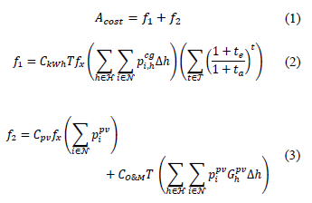 Desde un punto de vista económico, la idea principal de integrar generadores fotovoltaicos al sistema de distribución, es minimizar los costos anuales de operación y mantenimiento del sistema sumado con los costos totales de compra de energía en la red eléctrica [25]. Las Ecuaciones desde (1) hasta (3) representan la función objetivo y los factores asociados a ella, respectivamente.