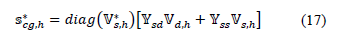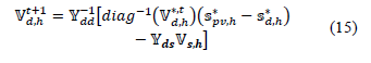 En este caso el operador diag(Z) convierte el vector Z en una matriz diagonal y Z∗ representa valor complejo conjugado del vector Z. Haciendo un análisis de la Ecuación (15) se puede concluir lo siguiente: (i) t es el contador iterativo; (ii) 𝕍𝒅,𝒉 es el vector contiene todas las tensiones de los nodos de demanda en un intervalo de tiempo h. Cuando t = 0 el vector 𝕍𝑑,ℎ 0= 1∠0◦; (iii) las matrices de admitancia 𝕐𝒅𝒅 y 𝕐𝒅𝒔 relacionan conjuntamente los nodos de demanda con los nodos de demanda y los nodos de demanda con el nodo slack, respectivamente; (iv) 𝕤*𝑝𝑣,ℎ es el vector que contiene las inyecciones de potencia compleja por parte de las fuentes PV; (v) 𝕤*𝑑,ℎ es el vector que contiene el consumo constante de potencia compleja en los nodos de demanda; (vi) 𝕍𝒔,𝒉 representa el valor de tensión del nodo slack, el cual es un valor conocido para realizar el estudio de flujo de potencia.