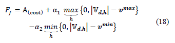 Una vez sean calculados los parámetros definidos en (15) y (17), se evalúa la función objetivo para cada individuo de la serie de soluciones candidatas resultantes de la etapa maestra. La ventaja principal de usar una función de adecuación en lugar de la función objetivo original es que ayuda al optimizador propuesto a explorar regiones no factibles en busca de soluciones óptimas globales en las áreas factibles promisorias e inexploradas del espacio de solución [33], [34]. Nótese que La función de adaptación y la función objetivo tomarán el mismo valor numérico si el espacio de solución es factible y si se cumplen todas las restricciones del modelo matemático descritas en (1)-(11). La función de adaptación propuesta se define en la Ecuación (18).