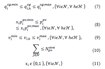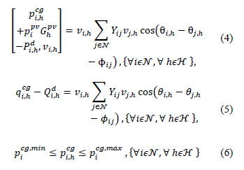 donde los términos 𝑃𝑖,ℎ𝑑 y 𝑄𝑖,ℎ𝑑 son las demandas de potencia activa y reactiva en el nodo i durante el periodo de tiempo h. 𝑞𝑖,ℎ𝑐𝑔 es la inyección de potencia reactiva en la fuente convencional conectada al nodo i durante el periodo de tiempo h. 𝑣𝑖,ℎ y 𝑣𝑗,ℎ indican las magnitudes de tensión en los nodos i y j en el periodo de tiempo h, respectivamente, mientras que 𝑌𝑖𝑗 es la magnitud de la admitancia que relaciona los nodos i y j, la cual tiene un ángulo 𝜙𝑖𝑗 . 𝜃𝑖,ℎ y 𝜃𝑗,ℎ son los valores del ángulo de tensión en los nodos i y j durante cada periodo de tiempo h, respectivamente. Los términos 𝑝𝑖𝑐𝑔,𝑚𝑖𝑛 y 𝑝𝑖𝑐𝑔,𝑚𝑎𝑥 representan los límites de generación de potencia activa asociados con el generador convencional conectado al nodo i, en contraste 𝑞𝑖𝑐𝑔,𝑚𝑖𝑛 y 𝑞𝑖𝑐𝑔,𝑚𝑎𝑥 representan los límites de generación de potencia reactiva asociados de igual manera. 𝑥𝑖 hace referencia a la variable binaria asociada a la inyección o no inyección de una fuente PV en el nodo i, para lo cual la variable será equivalente a 𝑥𝑖 = 1 o 𝑥𝑖 = 0, respectivamente. 𝑝𝑖𝑝𝑣,𝑚𝑖𝑛 y 𝑝𝑖𝑝𝑣,𝑚𝑎𝑥 son los tamaños mínimo y máximo permitidos para la integración fotovoltaica en la red de distribución.