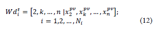 donde Wd¡t representa a un individuo i de la población de arañas en la iteración t, la dimensión de este vector es de 1 x 2Npvava. kcorresponde a un número entero aleatorio el cual representa un nodo del sistema. Ni es el número total de individuos de la población de viudas negras. Nótese que cada individuo de la población de arañas está dividido en dos partes. La primera parte Npvava se relaciona con la parte entera de la codificación, es decir, los nodos donde los sistemas de generación PV pueden ser instalados; mientras que, la segunda parte del vector, es la parte continua de la codificación, en otras palabras, se encarga de definir los tamaños óptimos de los sistemas PV.