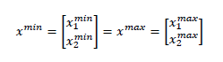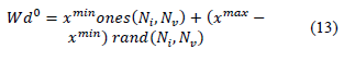 donde 𝑜𝑛𝑒𝑠(𝑁𝑖,𝑁𝑣) ∈ ℝ ??𝑖×𝑁𝑣 representa una matriz llena de unos. 𝑟𝑎𝑛𝑑(𝑁𝑖,𝑁𝑣) ∈ ℝ 𝑁𝑖×𝑁𝑣 representa una matriz llena de números aleatorios entre 0 y 1 generados por una distribución normal. Finalmente, 𝑥𝑚𝑖𝑛∈ ℝ𝑑𝑖𝑚×1 y 𝑥𝑚𝑎𝑥 ∈ ℝ𝑁𝑣×1 son vectores que representan los limites inferior y superior del espacio de solución, como se muestra a continuación: