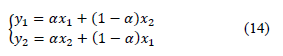 donde 𝑥1 ∈ ℝ1×Nv y 𝑥2 ∈ ℝ1×Nv son los padres, 𝑦1 ∈ ℝ1×Nv y 𝑦2 ∈ ℝ1×Nv son las crías y α ∈ ℝ1×Nv es una vector con números aleatorios entre 0 y 1, el cual funciona como coeficiente para la creación de las crías. Este proceso se efectúa para todos los emparejamientos de la población inicial y se repite Nv 2 veces. Finalmente, tanto los hijos, como los padres se organizan de acuerdo al valor de su función de adaptación, para luego ser sometidos al canibalismo. Este proceso se replica para todas las parejas. El canibalismo se puede llevar a cabo de tres formas distintas, las cuales se enuncian a continuación [28]: