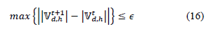 El proceso iterativo de la Ecuación (15) continuará hasta que la diferencia entre las tensiones 𝕍𝑑,ℎ𝑡+1 y 𝕍𝑑,ℎ𝑡 cumpla con el criterio de convergencia mostrado en la Ecuación (16).