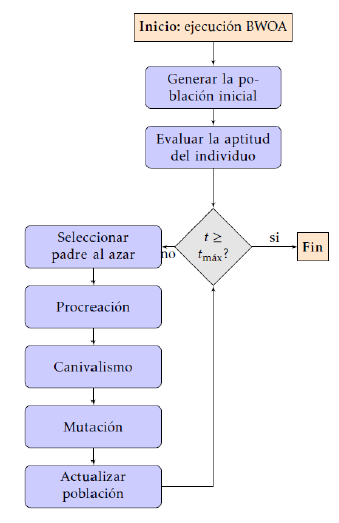 El DCBWOA es un algoritmo de optimización bioinspirado que replica el comportamiento de la viuda negra [28]. Dicho comportamiento se puede modelar a través de algunas reglas de evolución sencillas que van a permitir una correcta exploración y explotación del espacio de solución, como se muestra en la figura 1. El algoritmo BWOA, como otros algoritmos evolutivos, comienza con la población inicial de arañas para que cada araña represente una posible solución. Estas primeras arañas, en parejas, intentan reproducir la nueva generación. La viuda negra se come a la araña macho durante o después del apareamiento. Luego lleva el esperma almacenado a sus cavidades de esperma y lo libera en los sacos de óvulos. Once días después de la fertilización, las arañas emergen de los sacos de huevos. Viven en la red madre durante varios días a una semana, tiempo durante el cual se observa que se comen a los hermanos más débiles [28], [29], [30].