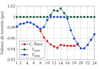 Es importante resaltar que entre las horas 9 y 16, se ve un mejoramiento significativo en el perfil de tensión respecto al caso base, esto se debe a que en ese periodo de tiempo la generación fotovoltaica alcanza un alto porcentaje de efectividad al generar energía eléctrica. En contraste, cuando la generación PV no actúa, se observa que el perfil de tensión tiende a ser igual que el del caso de referencia lo cual es frecuente en estos sistemas PV sin almacenamiento de energía.
