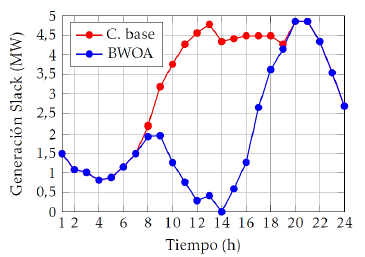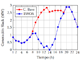 En la figura 7 se puede apreciar el comportamiento de la Potencia de generación diaria en el nodo Slack para el caso de referencia y para la solución óptima que proporcionó el BWOA, al igual que en sistema de prueba IEEE 34-nodos, durante el tiempo en que las fuentes PV se encuentran activas, la generación de potencia en el nodo slack es caracterizada por la llamada curva de pato, en esta curva se puede detallar también que en la hora 14 se presenta el valor mínimo de potencia generada con 0.001MW, esto quiere decir que durante este periodo de tiempo la demanda es sustentada principalmente con la generación fotovoltaica.