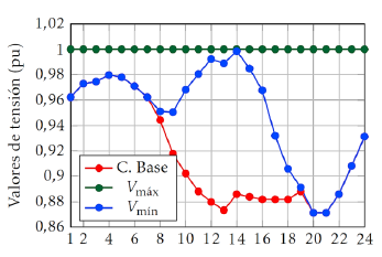 Por otro lado, la figura 6 representa los valores de tensión máxima y mínima para los 85 nodos del sistema IEEE según la solución proporcionada por el BWOA. Es posible apreciar que en los periodos de tiempo entre las horas 20 y 21 los perfiles de tensión de la red tuvieron un mínimo de 0.8713 pu, esta es una condición operativa normal para este sistema debido a que la única fuente en este período de tiempo es el nodo slack, la demanda en este punto fue máxima y la generación fotovoltaica fue cero [39].