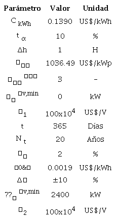 Para determinar el valor de la función objetivo definida en la Ecuación (12), la información paramétrica considerada para el caso es encontrada en la tabla 1. Esta información fue recompilada de los datos disponibles en [37] y [38].